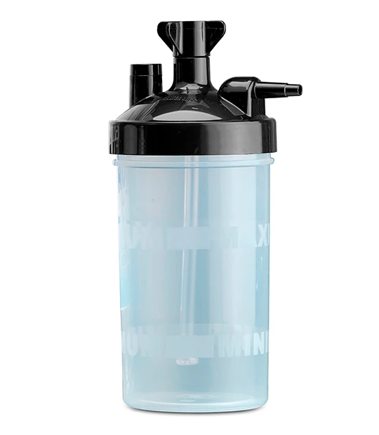 Humidificador de oxígeno, sistema de burbuja, con filtro en línea de agua, escala señalizadora de agua, y alarma a de 4 a 6 PSI., descartable.